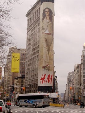 Is this what it would look like if Christo went into advertising rather than art? Granted, Manhattan’s Flatiron building did have a narrow flank of scaffolding running up its prow, but our correspondent Alan sends in this photo of a freshly installed Amazonian H&M model who looks ready to stomp across the landscape of Madison Square Park. No longer is a flat expanse necessary to sell anything, as recent explorations of the subway have shown. I am just concerned that the Statue of Liberty may soon start selling The Swiffer.