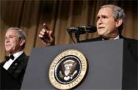 Attack of the clones. Bush look-alike visits dinner too. Bush: “Ladies and gentleman, I feel chipper tonight. I survived the White House shakeup.”