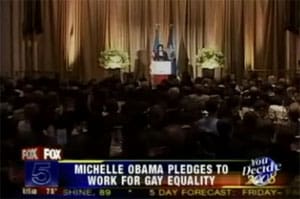 Michelle Obama and NY Governor David Paterson's wife Michelle spoke to 200 donors at the DNC's Gay & Lesbian Leadership Council dinner last night at the Waldorf Astoria in New York, and event which raised $1.3 million, according to organizers. Obama received most of the attention from the mainstream press, but you can see a very brief clip of both of them speaking, AFTER THE JUMP…