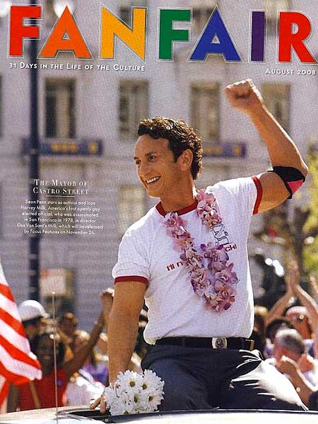 Sean Penn as Harvey Milk takes the front page of Vanity Fair‘s August 2008 “Fanfair” section. The film opens November 26.