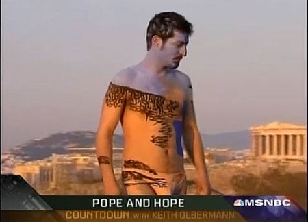Barack Obama and Pope Benedict have been celebrated by a fusion of nearly naked men (and a couple of women) atop a hill near the Acropolis in Athens: