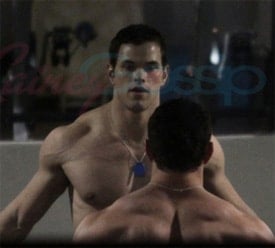 Twilight's Kellan Lutz checks himself out at a gym in Vancouver.