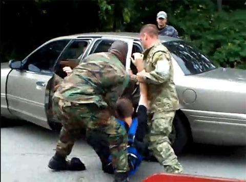 Some people are saying that the video's fake, but here's another one from the same user of the guy in the red bandanna moments later, being arrested more conventionally, if you can use that term: