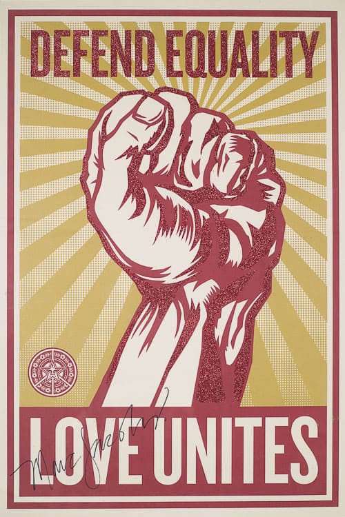 More than 80 entertainers and political figures including Julia Roberts, Robert De Niro, Anne Hathaway, Mayor Gavin Newsom, Scarlett Johansson, Chris Pine, Jessica Biel, Natalie Portman, Bradley Cooper, Lance Bass, Dave Matthews, Jared Leto, and Charlie Sheen have contributed signatures and/or enhancements to a set of "Defend Equality – Love Unites" original prints with a design by Shepard Fairey which became well-known during California's campaign against Proposition 8.