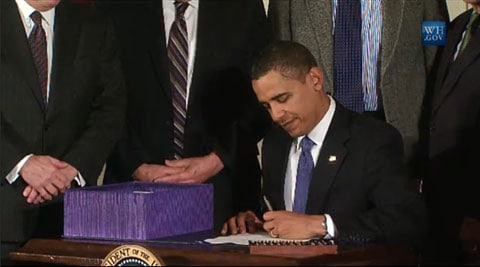 Said Obama: "Now, speaking of that, there is one more long-awaited change contained within this legislation that I'll be talking about a little more later today. After more than a decade of opposition and delay, we've passed inclusive hate crimes legislation to help protect our citizens from violence based on what they look like, who they love, how they pray, or who they are. I promised Judy Shepard, when she saw me in the Oval Office, that this day would come, and I'm glad that she and her husband Dennis could join us for this event. I'm also honored to have the family of the late Senator Ted Kennedy, who fought so hard for this legislation. And Vicki and Patrick, Kara, everybody who's here, I just want you all to know how proud we are of the work that Ted did to help this day — make this day possible. So — and thank you for joining us here today. (Applause.) So, with that, I'm going to sign this piece of legislation."