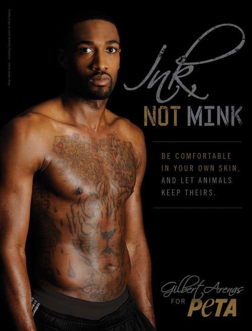 Writes PETA: "NBA guard Gilbert Arenas scores points for animals and joins other legendary sports stars and celebrities by posing for PETA's 'Ink, Not Mink' campaign. Gilbert shows off his tattoos and bares his skin to help animals keep theirs…Gilbert's a fierce competitor on the court, but it's his compassion toward animals off the court that makes him a true all-star.Join Gilbert in refusing to contribute to animal suffering by not buying or wearing fur or fur trim!"