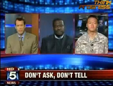 Says Choi: "You know, something that we learned in Iraq is that when a military is subordinated to the interests of a religious minority or a religious group of any sort, you have the same kind of social problems that the Middle East has that the countries that we are trying to liberate and to improve have and I don't think that America is built on those same foundations….I've faced racism in this country and homophobia and Harry Jackson I think it feels exactly the same."