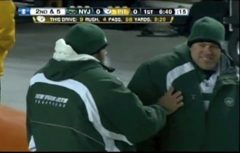 Yep, the Jets lost. The Steelers are going to the Super Bowl. But the one game clip that's being circulated the most this morning — on the WaPo and elsewhere — is this one of QB Mark Sanchez wiping his booger on backup QB Mark Brunell.