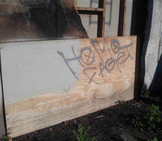 Bigoted vandals targeted a gay bar in Fresno, California earlier this week, spray-painting "homo" and "faget" on the walls and mirrors of the establishment. The Phoenix is currently under construction and slated to open in June. Bryan Beckstrand, who owns the bar along with his partner Karl Jensen, wrote about the incident on the bar's blog: