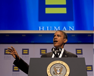 HRCOBAMA-300x243 President Obama was urged this week to come out for gay marriage in his address to the Human Rights Campaign. He didn't do so last night – not explicitly. But did he imply it? Toward the speech's end, he cited New York's marriage law as a triumph of democratic change. Might that be an indirect way of saying, "I'm with you on marriage"?