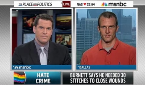 Today, Thomas Roberts spoke with Burke Burnett who was stabbed, beaten and burned in a vicious anti-gay attack in Reno, Texas last week. Burnett talked about the attack and the women who jumped in and helped save his life.