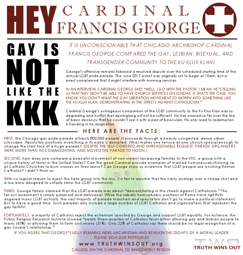 Gay rights group Truth Wins Out put more pressure on Chicago Archbishop Francis George to retire after comparing LGBT activists to the KKK late last month.