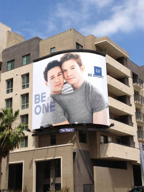 Speaking of companies who are choosing to be politically correct instead of focusing on selling clothes; GAP is also guilty. In Los Angeles, CA, GAP has a billboard located downtown that reads: "GAP- BE BRIGHT- BE ONE" with two homosexual men pressed together under a shared t-shirt. They are hugging each other and facing the camera cheek-to-cheek. "BE ONE" is in large letters which emphasizes the same-sex relationship.