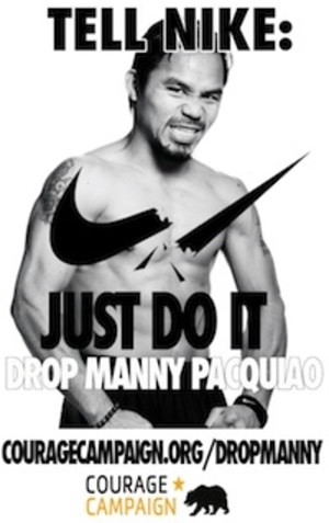First and foremost, the Courage Campaign is currently calling on Nike to drop Pacquiao as a spokesman.