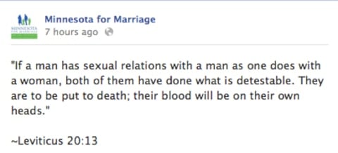 Minnesota For Marriage is now claiming that someone hacked their Facebook and posted that Leviticus quote calling for gay men to be put to death. The anti-gay group today posted the following message: