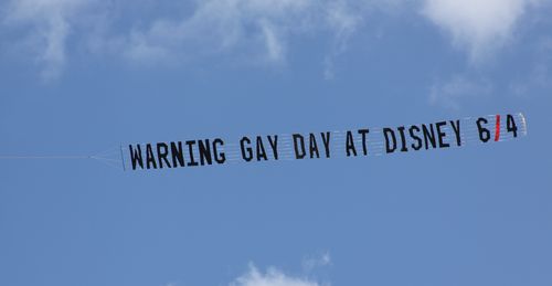 As it did last year, the hateful Florida Family Association is flying planes over Disney World warning visitors about gay people visiting the park for the annual Gay Days, tomorrow (photo is from last year).