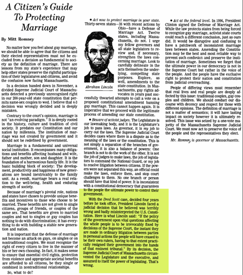 From Romney's op-ed, called “A Citizen's Guide to Protecting Marriage”: