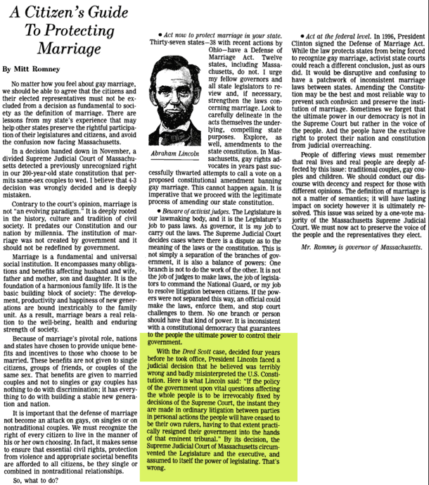 And then there was Romney's October 2004 Wall Street Journal op-ed equating a state Supreme Court ruling in favor of marriage equality and the 1857 Dred Scott decision that said black slaves were property and therefore not protected by the U.S. Constitution.