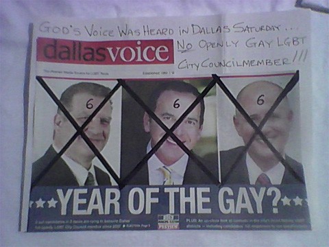 “God's voice was heard in Dallas Saturday. No openly gay LGBT City Councilmember!!” he wrote, in reference to the fact that all three lost their races. (Franko and Weisfeld ran against Adam Medrano in District 2)