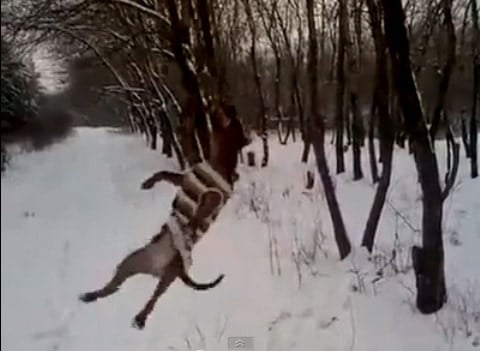 A tenacious pitbull faces down a tree branch, and does so in a stylish striped tank top.