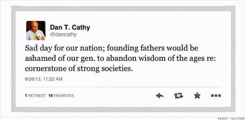 Said Cathy's tweet: "Sad day for our nation; founding fathers would be ashamed of our gen. to abandon wisdom of the ages re: cornerstone of strong societies."