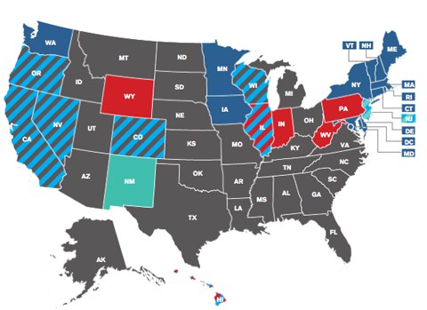 A new map from HRC indicates the states with marriage equality (solid blue), civil unions (lighter blue), domestic partnerships (lighter blue striped), constitutional marriage bans (gray), laws banning marriage equality (red), neither marriage equality nor a ban (turquoise).