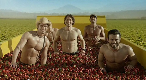Because the strawberries are gathered by happy, shiny, shirtless workers: