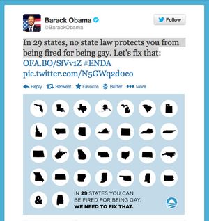 Over the weekend, President Obama tweeted the sad facts: "In 29 states, no state law protects you from being fired for being gay. Let's fix that."