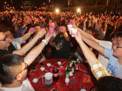 Participants sat around tables decorated with red cloths printed with the Chinese character for “wedding”, as they had dinner and watched a video recording of local celebrities showing support as well as live performances in a makeshift banquet venue in a square outside the presidential office in Taipei.