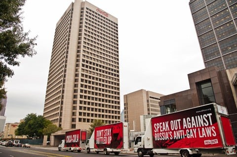Yesterday, the activist group All Out hired three trucks to circle Coca-Cola's global headquarters in Atlanta starting at 8 am ET and throughout the entire day, with billboards urging the company to call for a repeal of Russia's anti-gay laws before the 2014 Winter Olympics in Sochi, Russia.