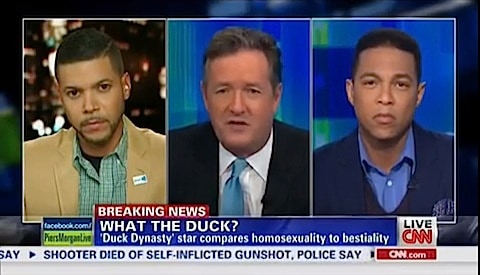 Piers Morgan spoke last night with GLAAD's Wilson Cruz and CNN's Don Lemon, both gay men, about the suspension of Duck Dynasty star Phil Robertson for anti-gay remarks he made in a GQ interview.