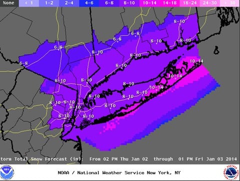 The top map is via CBS This Morning, and the lower map is a new forecast just put by the NWS for the New York area. Get your boots out.