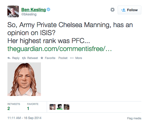 Army Pvt. Chelsea Manning, the U.S. intelligence analyst who made headlines in 2013 after leaking thousands of classified documents depicting abuse and torture being carried out by U.S. soldiers to WikiLeaks, recently took to The Guardian to share her thoughts on how the American military could best deal with the Islamic State of Iraq and the Levant, colloquially known as ISIL or ISIS. They key to dismantling the jihadist group, Manning says, is to let its leaders prove how unsustainable its hypothetical caliphate would be in reality.