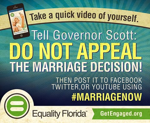This is where you help! Make a video telling Governor Scott not to appeal the marriage decision and post it to Facebook/Twitter/Youtube – and use the hashtag #MarriageNow.