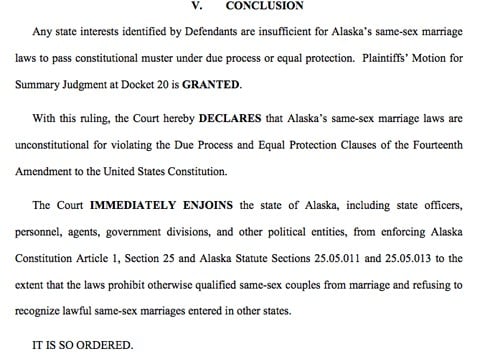 Judge Timothy Burgess wrote in a summary judgment that Alaska's "refusal to recognize same-sex marriages lawfully entered in other states is unconstitutional as a deprivation of basic due process and equal protection principles under the Fourteenth Amendment of the U.S. Constitution."
