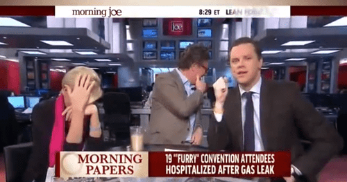 MSNBC host Mika Brzezinski struggled to get through her on-air coverage on the Chlorine gas leak that hospitalized 19 "furries" who attended the annual Midwest FurFest Convention, after learning what furries are from her co-hosts. The host was left quite speechless after seeing one of the participants dressed in a tiger suit and wearing what appears to be a wedding dress outside of the building that was evacuated. The furry subculture involves interests in furry, anthropomorphic animal characters with human personalities and characteristics; some of its members include people from the LGBT community as well. Watch Brzezinski's incredulous reaction to the subculture and their "fursuits," AFTER THE JUMP…