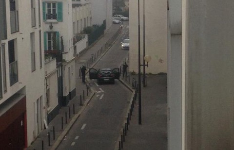 Les tireurs de #ChalieHebdo face à une voiture de police. Ils ont fait feu, les policiers ont répliqué puis reculé pic.twitter.com/Ld1sxkRLvW