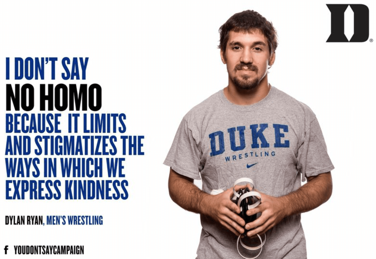 An ad campaign started by a group of college students to bring awareness and combat words that marginalize and belittle people based on their sexual orientation, gender, race or disability has now blossomed to include 41 student-athletes from Duke University reports Outsports. The athletes pose in uniforms and training outfits next to words they don't say and why they don't say them. The campaign was founded by senior Daniel Kort and juniors Anuj Chhabra, Christie Lawrence and Jay Sullivan and on Jan. 7 issued its second online push featuring the student athletes.