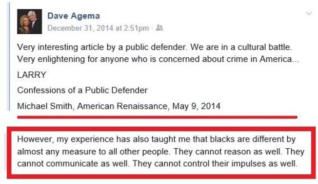 In a New Years' Eve posting on his infamous Facebook page, disgraced Michigan GOP national committeeman Dave Agema reprinted an essay about African-Americans. Either Agema or somebody he is quoting endorses it as “very interesting” and “very enlightening” for “anyone concerned about crime in America.” The essay – since taken down by Agema – is copied from the May 9 edition of American Renaissance, a white supremacist magazine.