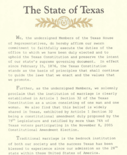 The House Republican Caucus on Friday released a letter reaffirming its support of the state's long-standing ban on gay marriage, calling marriage between a man and woman a “principle that is so dearly held by Texans far and wide.”