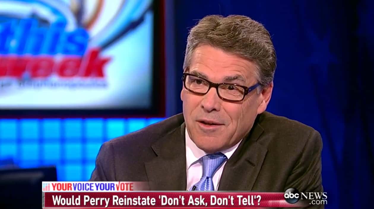 On This Week George Stephanopoulos sat down with Texas Governor Rick Perry and asked the Republican about his stance on gays serving openly in the military.