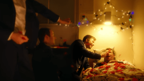The boys' cover of “Santa Baby” ups the ante with both an impressive video shot all over Oxford and a gay lyrical change. One member, Tim, lying in bed, fantasizing about cute boys as he sings, “Santa Baby, think of all the fun I've missed… think of all the fellas that I haven't kissed.”