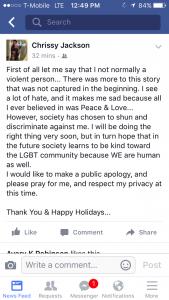 “First of all let me say that I not normally a violent person… There was more to this story that was not captured in the beginning. I see a lot of hate and it makes me sad because all I ever believed in was peace and love. However, society has chosen to shun and discriminate against me. I will be doing the right thing very soon but in turn hope that in the future society learns to be kind toward the LGBT community because we are human as well. I would like to make a public apology and please pray for me and respect my privacy at this time. Thank you and happy holidays.”