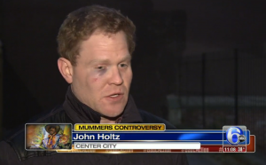 In another incident, 28-year-old John Holtz said he was walking his mother's dog with friends when he noticed a group of intoxicated Mummers in face paint and costumes, urinating in an alley. From Philly.com: