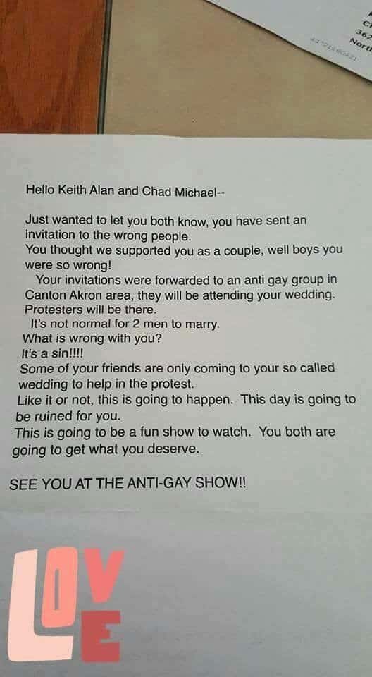 A gay couple from Canton, Ohio recently received a hateful and threatening RSVP to their wedding invite which they sent out only to family and friends.