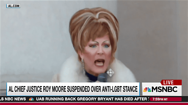 The fact that a home-grown Alabama drag queen is among his most outspoken critics has apparently been driving Roy Moore nuts. After he got suspended from the bench on Friday night, Roy Moore couldn't help himself. The judge put out an enraged statement, accusing the state's judicial commission of “choosing to listen to people like Ambrosia Starling, a professed transvestite, and other gay, lesbian and bisexual individuals as well as organizations that support their agenda.”