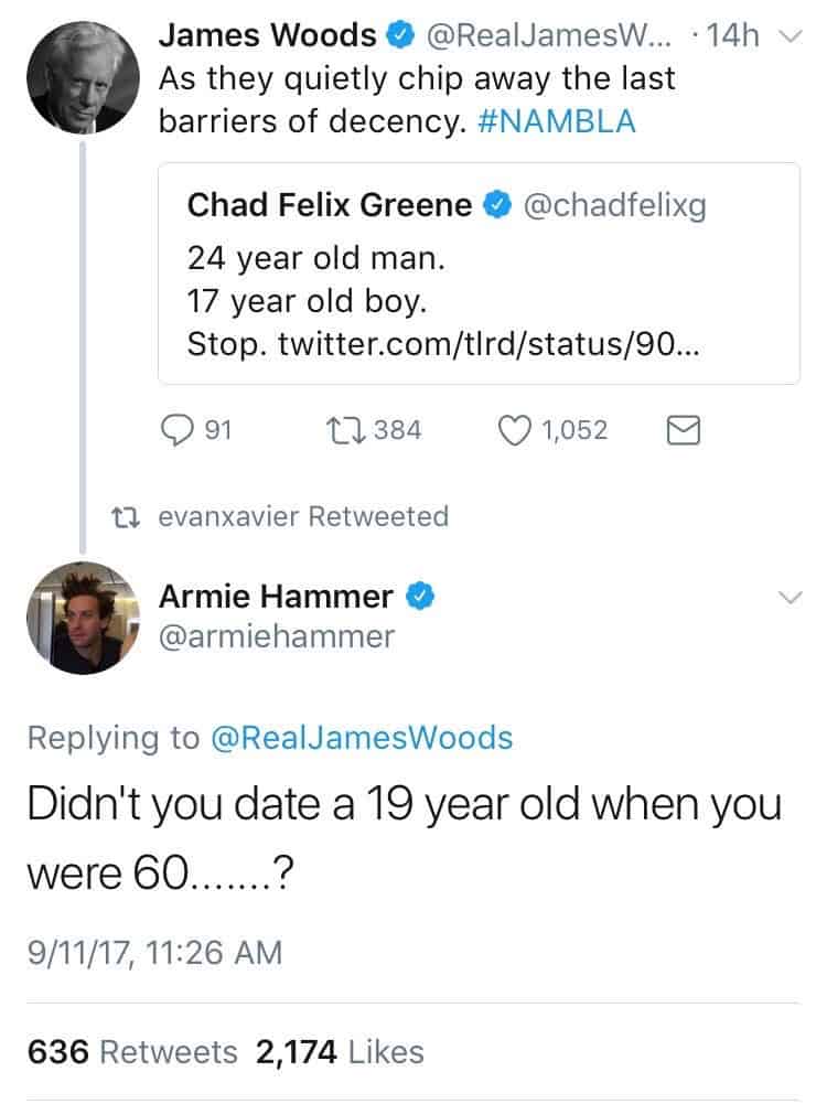 Armie Hammer destroyed conservative troll and faded actor James Wood after Woods blasted Hammer's new film Call Me By Your Name.