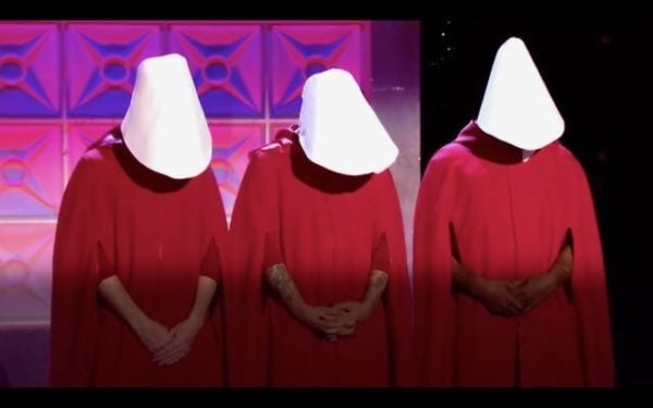 We get one more post-elimination Handmaid's vignette, and, as predicted, the pay-off hits next week. They bring out three hooded queens onto the runway, two of which (according to my very scientific tattoo comparisons) are Chi Chi and Aja. The third should be the recently eliminated Milk, but looks to have too small a frame, so my guess is Morgan. We'll see how it plays it out next week.