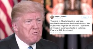 Ignoring his own record, Donald Trump denounced racism on Saturday a day ahead of a ‘Unite the Right’ white supremacist and neo-Nazi rally in Washington D.C. on Sunday. Tweeted Trump: “The riots in Charlottesville a year ago resulted in senseless death and division. We must come together as a nation. I condemn all types of … Continue reading Ignoring His Record, Trump Condemns Racism and Violence Ahead of D.C. White Supremacist Rally