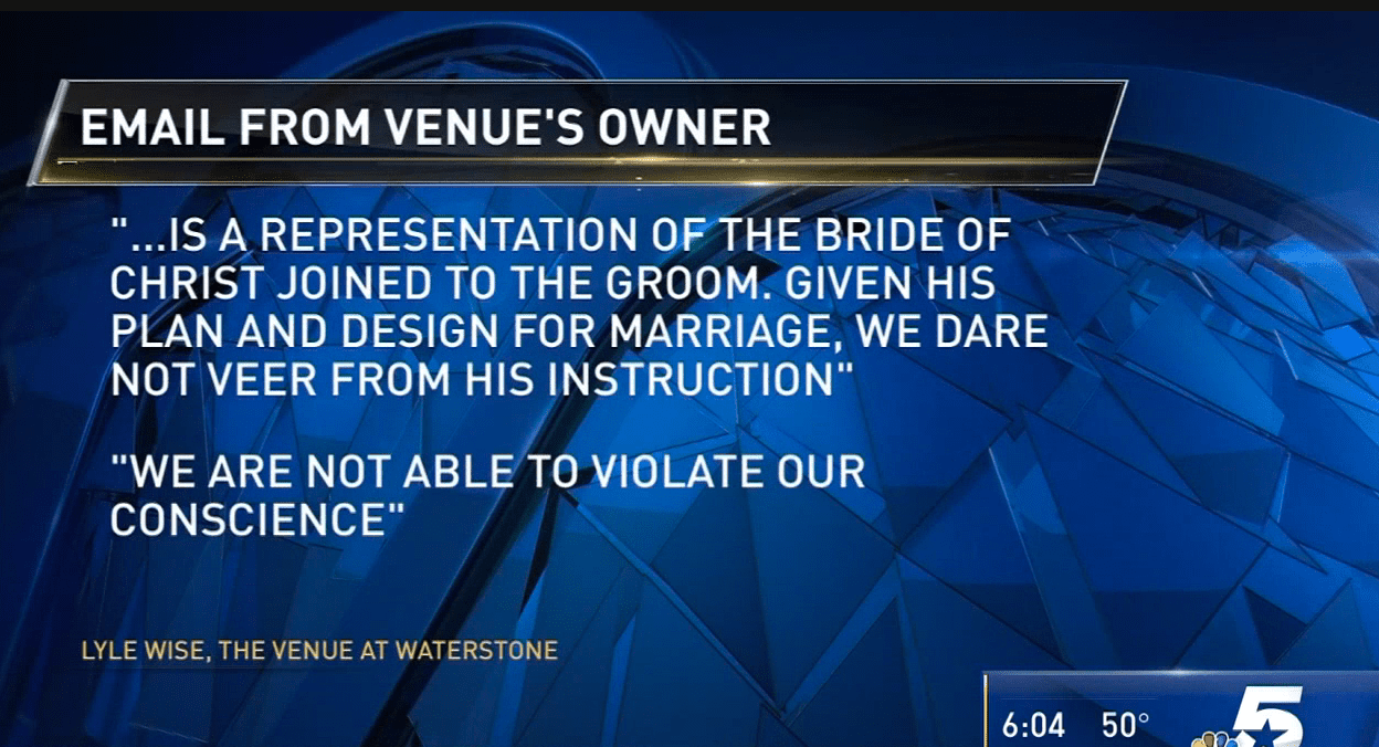 In an email, The Venue at Waterstone's owner told the couple he believed marriage “is a representation of the bride of Christ joined to the groom (Christ who is the very God we worship). Given His plan and design for marriage, we dare not veer from His instruction… we are not able to violate our conscience.”